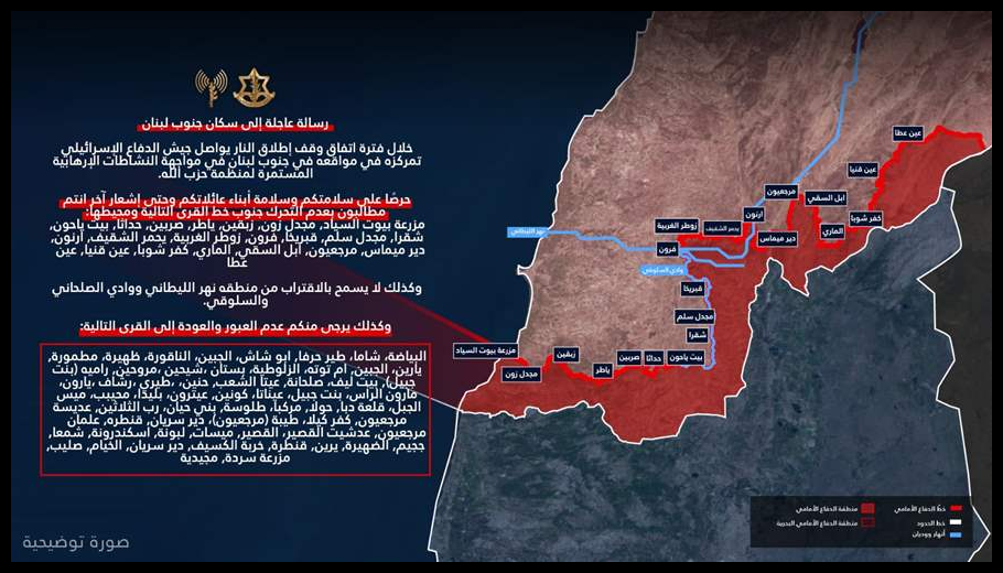 ⭕️حرصًا على سلامتكم وسلامة أبناء عائلاتكم وحتى إشعار آخر انتم مطالبون بعدم التحرك جنوب خط القرى التالية… pic.twitter.com/bncWx0k4Ts