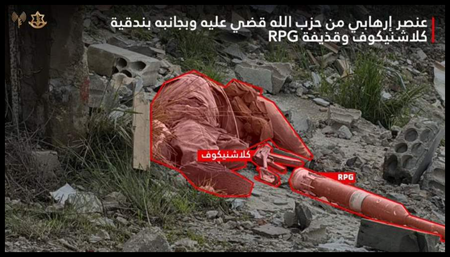 “صورة أحد عناصر حزب الله بعد ان قضت عليه قوات غولاني في جنوب لبنان. الجنوب مقبرة حزب الله”.