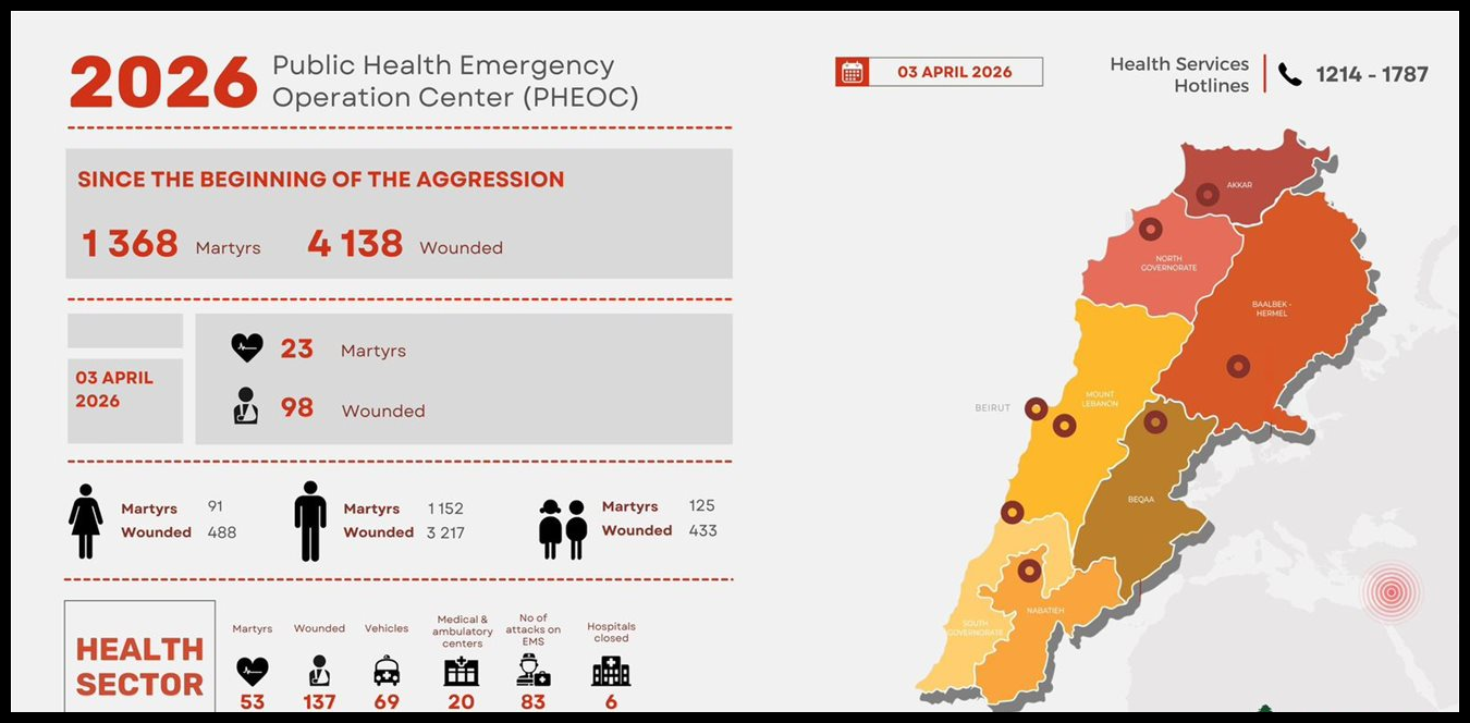 نشرت وزارة الصحة العامة التقرير اليومي لمركز عمليات طوارئ الصحة عن تطورات العدوان الإسرائيلي على لبنان، وفيه أن “العدد الإجمالي للشهداء منذ 2 آذار حتى 3 نيسان ارتفع إلى 1368، كما ارتفع عدد الجرحى الى 4138”.