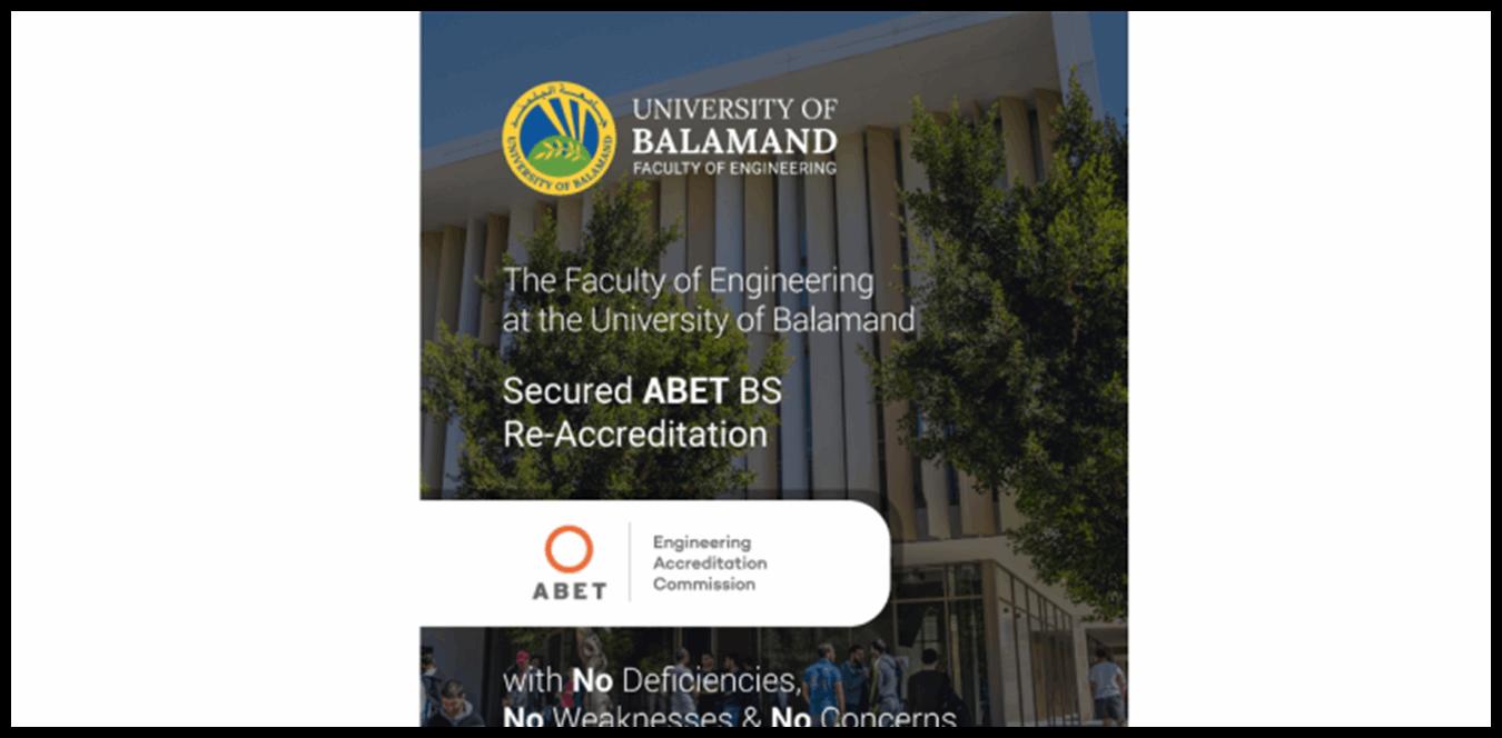 حققت كلية الهندسة في جامعة البلمند إنجازًا أكاديميًا استثنائيًا بتجديد اعتماد ABET لجميع برامج البكالوريوس الخمسة، وهي: الهندسة المدنية، والكهربائية، والكيميائية، وهندسة الكمبيوتر، والهندسة الميكانيكية، دون أي نواقص أو ملاحظات. وقد حظي برنامج الهندسة المدنية بإشادتين رسميتين من لجنة الاعتماد، في سابقة غير مسبوقة على مستوى لبنان، للفترة الممتدة بين 1 تشرين الأول 2025 و30 أيلول 2031.
