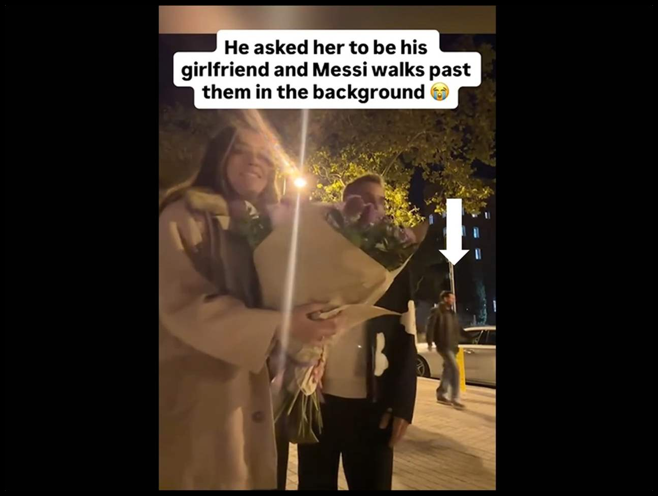 أثار مقطع فيديو متداول على منصّات التواصل تفاعلاً واسعا، بعد أن وثّق لحظةً عاطفيةً لشابٍ يطلب من شابةٍ أن تكون حبيبته، قبل أن يظهر ليونيل ميسي وهو يمرّ بهدوء في الخلفية دون أن يلحظ الموقف على ما يبدو.